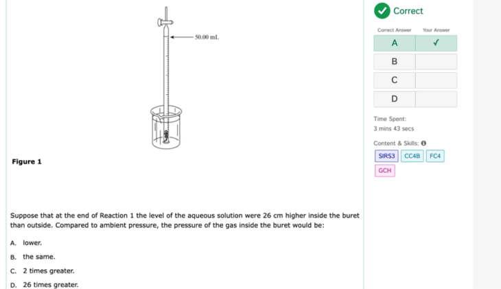 The solution is A. If the pressure of the gas inside the buret were the same or higher than atmospheric pressure, the level of the solution inside the buret would be the same or lower as outside, corresponding to answer choices B, C, or D. But the question states that the solution inside the buret is higher than it is outside. Therefore, neither B, C, or D can be correct, leaving answer choice A.