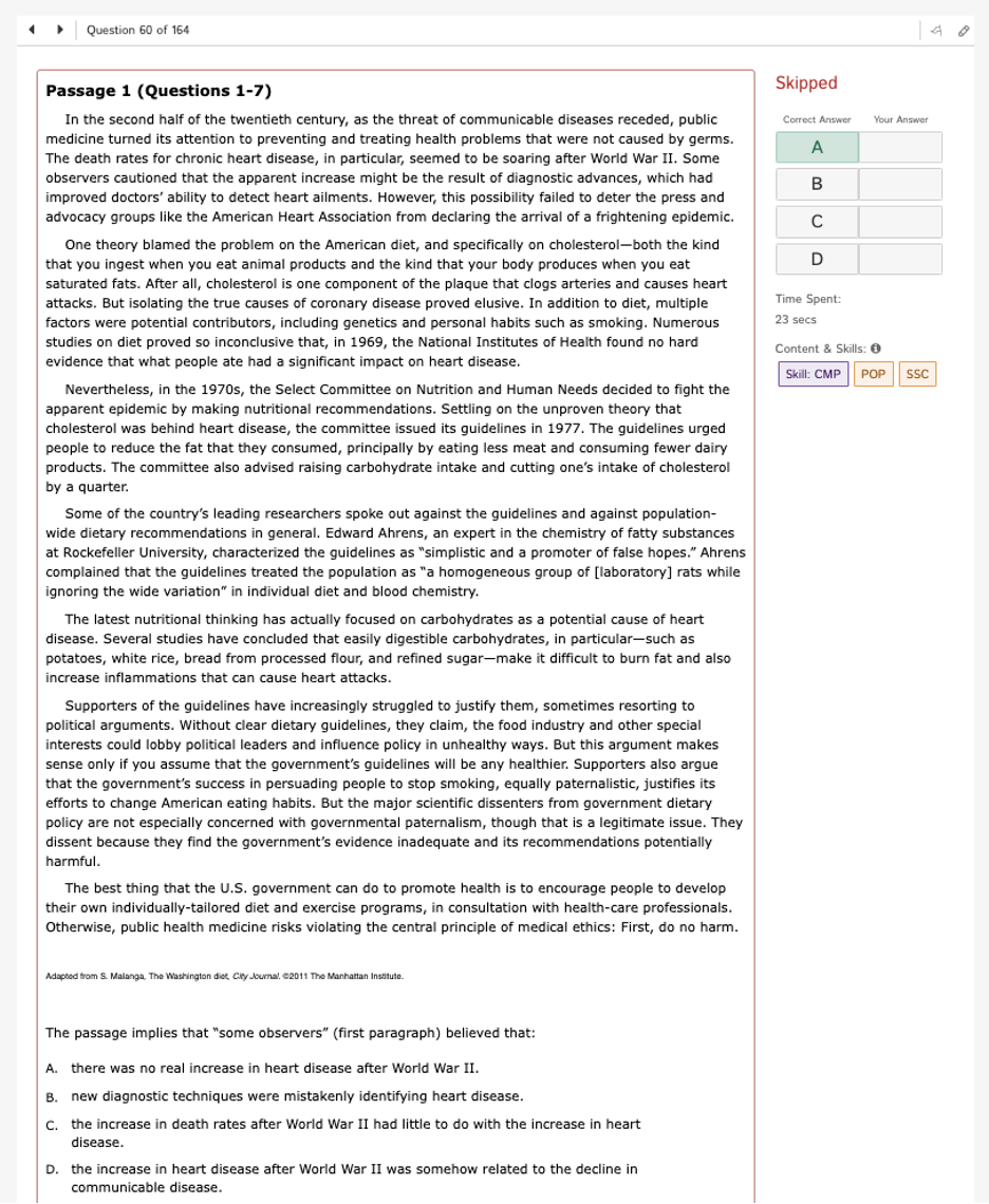 The correct answer is A. In paragraph 1, the author writes that “some observers” thought that the increase in heart disease deaths was merely “apparent” and that improved “ability to detect heart ailments” might be a better explanation. This suggests some felt like there was no increase in heart disease (as stated by Option A) and that the soaring numbers were the result of improved diagnostics.