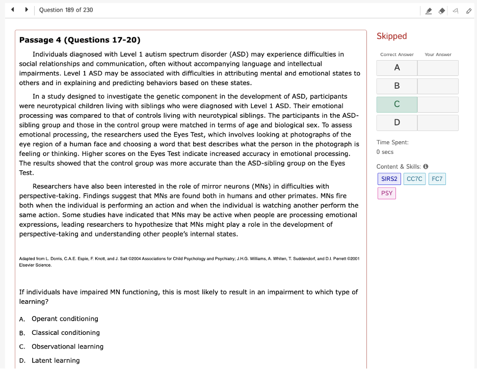 Below is a sample question from the Psych/Soc section of the AAMC’s Free MCAT Sample Test.