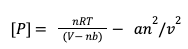 The variable a is a constant representing the strength of the attractive forces. The variable n represents moles of gas, while v represents the volume. The relationship “n over v” is moles per volume, which expresses the concentration of gas particles in a container. The greater the concentration of gas particles, the more intermolecular interactions the gas molecules will have. A greater number of intermolecular interactions will lead to a reduced number of collisions, decreasing the total pressure. Stronger and more numerous intermolecular interactions will decrease the pressure of real gases, so an2/v2 is the correction for pressure. This equation can be re-written into the typical form of the Van der Waals equation for real gases.