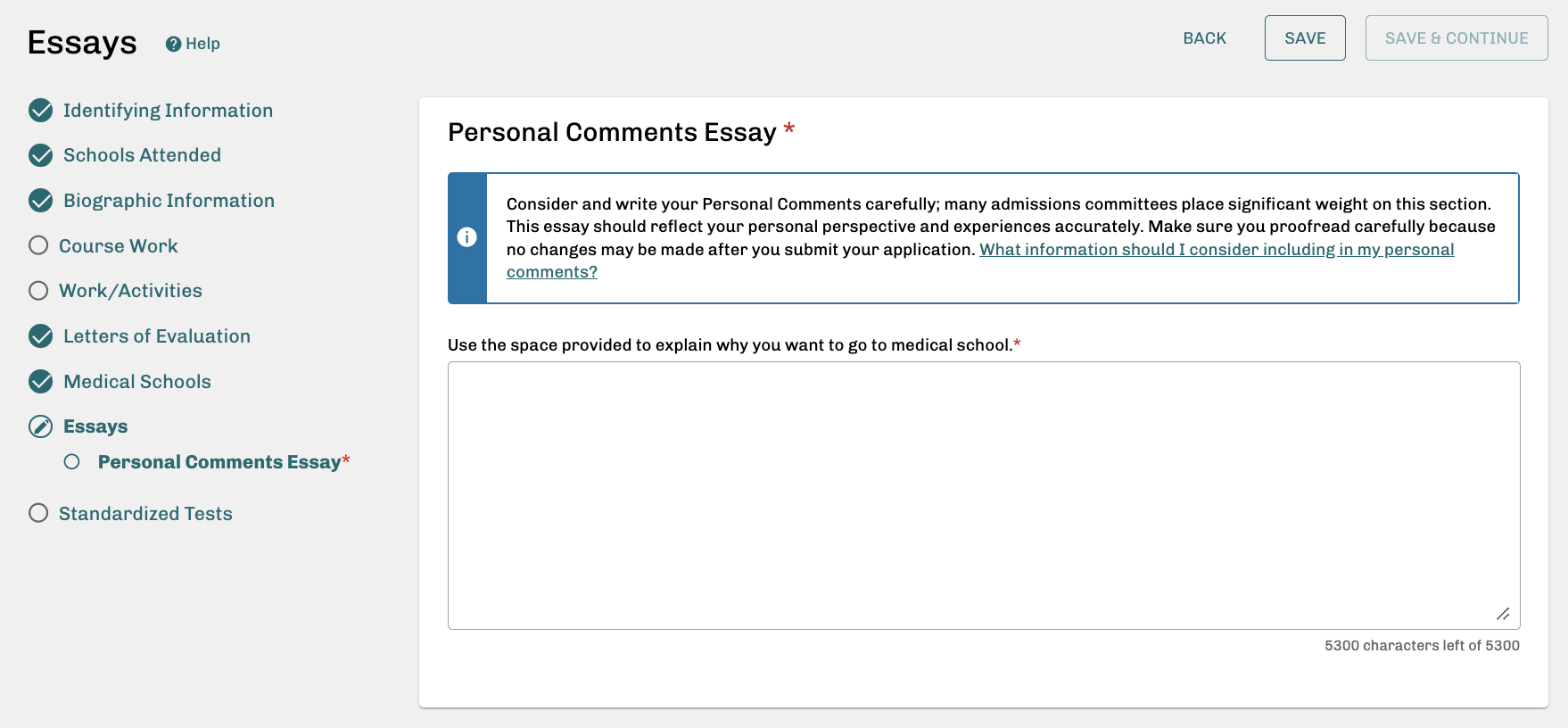 You must fill out the Identifying Information and Schools Attended sections before you can proceed to other sections. The Medical Schools section can only be opened after you’ve completed the Biographic Information section.
